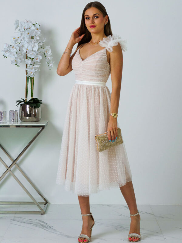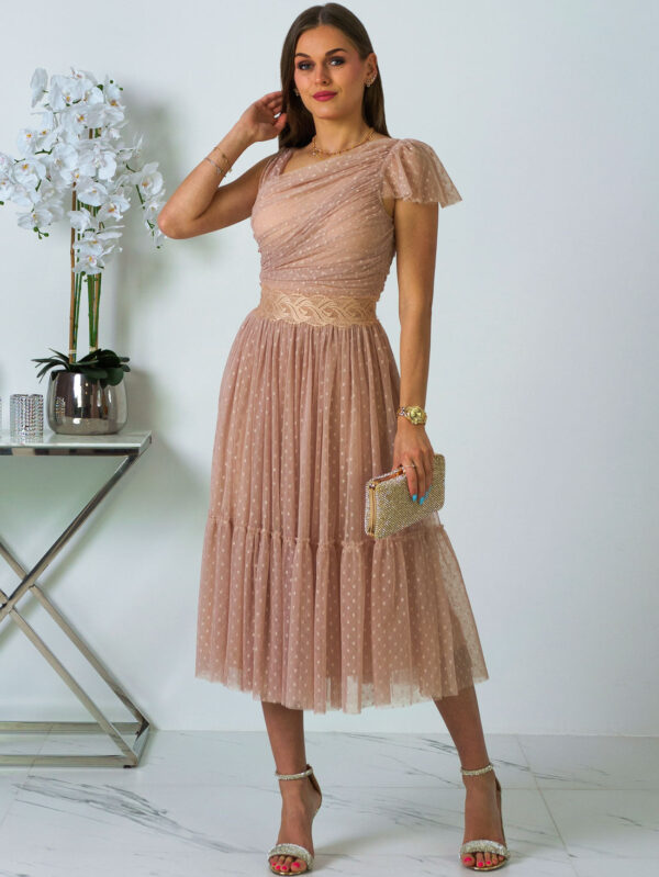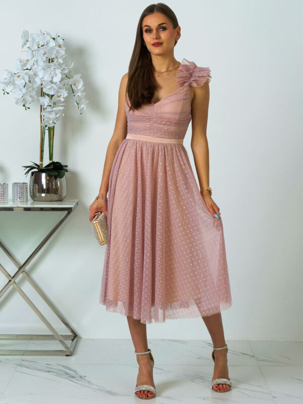 Andrea - Sukienka midi tiulowa z koronką brudny róż na wesele