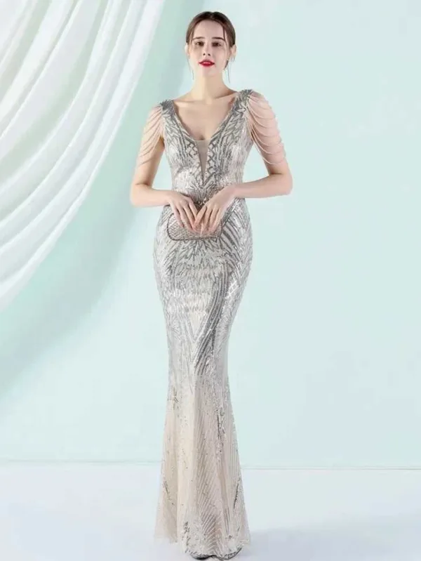 Bonita - Sukienka maxi cekinowa z rozcięciem srebrna na wesele